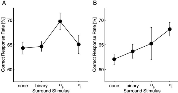 Psychophysical data from Experiment 1. For the small target (A), the correct response rate was significantly improved by surrounding low-pass white noise filtered with the same Gaussian function used for the target (σs). In addition, a similar tendency was observed for the large target (B). For both targets, high contrast (0.95) binary noise did not produce an observable effect. Error bars represent the standard error.