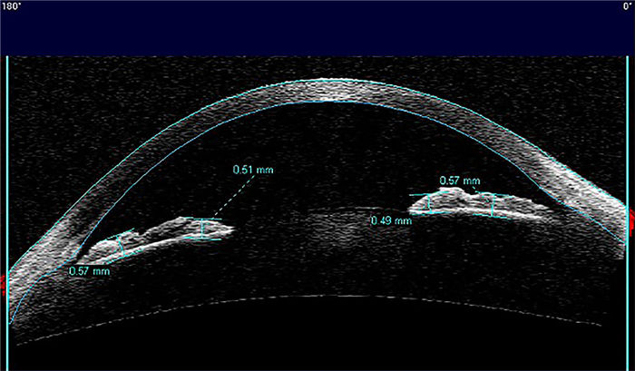 Visante OCT captures and analyzes the cross-sectional images of cornea, anterior chamber, iris and the central portion of the lens using a non-invasive technique based on low coherence interferometry. This tool is particularly useful to visualize narrow angles and to provide accurate measurements of anterior chamber depth [17].