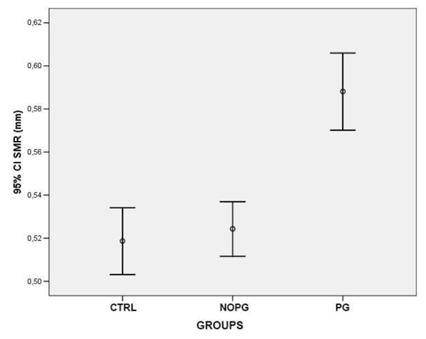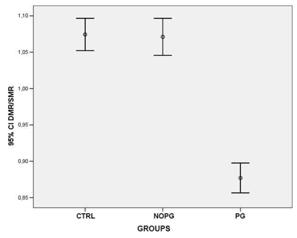 | DMR/SMR ratio | 0,88 ± 0,085 | 1,07 ± 0,099 | 1,07 ± 0,092 | <0,0001 |