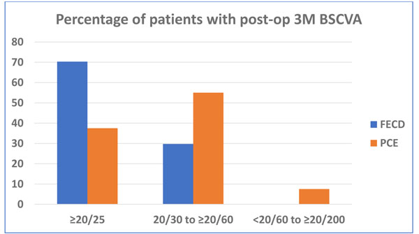100 consecutive eyes of 95 patients were included in this study. There were 56 males and 39 females with a mean age of 62.3 ± 10.4 years (range: 29 to 80 years). All patients had clinically significant corneal stromal edema, microcystic epithelial edema or frank bullous keratopathy. 43 (43%) eyes were phakic and 56 (56%) were pseudophakic. 38 (38%) eyes had moderate Fuchs′ endothelial corneal dystrophy with various grades of cataract. In all phakic eyes - DMEK was combined with PE-PCIOL simultaneously (DMEK-triple). 53 (53%) eyes had pseudophakic corneal edema or bullous keratopathy. Preoperatively, in 56% of eyes, the BSCVA in the affected eye were between Light Perception (LP) to <20/200 (Table 1). Excluding patients with vision affecting comorbidities, the PCE/PBK patients presented with significantly worse BSCVA than the FECD group (Chi sq test: p=0.000055) (Fig. 1).