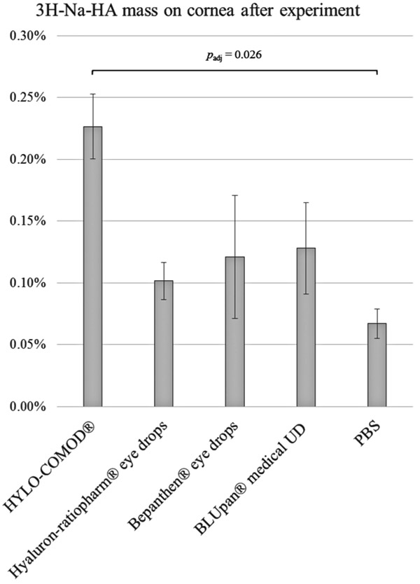 In the FC setting, only a small amount of 3H-Na-HA (close to the quantification limit) adhered to the ex vivo porcine corneas (Fig. 2). With regard to the amount of 3H-Na-HA that was applied at the start of the experiment, all of the tested eye drop formulations had comparable retention rates, as follows: 0.23% ± 0.03% for HYLO-COMOD®, 0.10% ± 0.02% for Hyaluron-ratiopharm® eye drops, 0.12% ± 0.05% for Bepanthen® eye drops, and 0.13% ± 0.04% for BLUpan® medical UD. In comparison, a considerably lower amount of 3H-Na-HA was obtained from the PBS-treated corneas (0.07% ± 0.01%). This amount was close to the quantification limit of the scintillation method. The total mass balance after the experiment was in the range of 81-102%, indicating a complete recovery. Although the data plots appeared to indicate that there were differences between the solutions, only HYLO-COMOD® was found to be significantly different from PBS (padj ≈ 0.026).