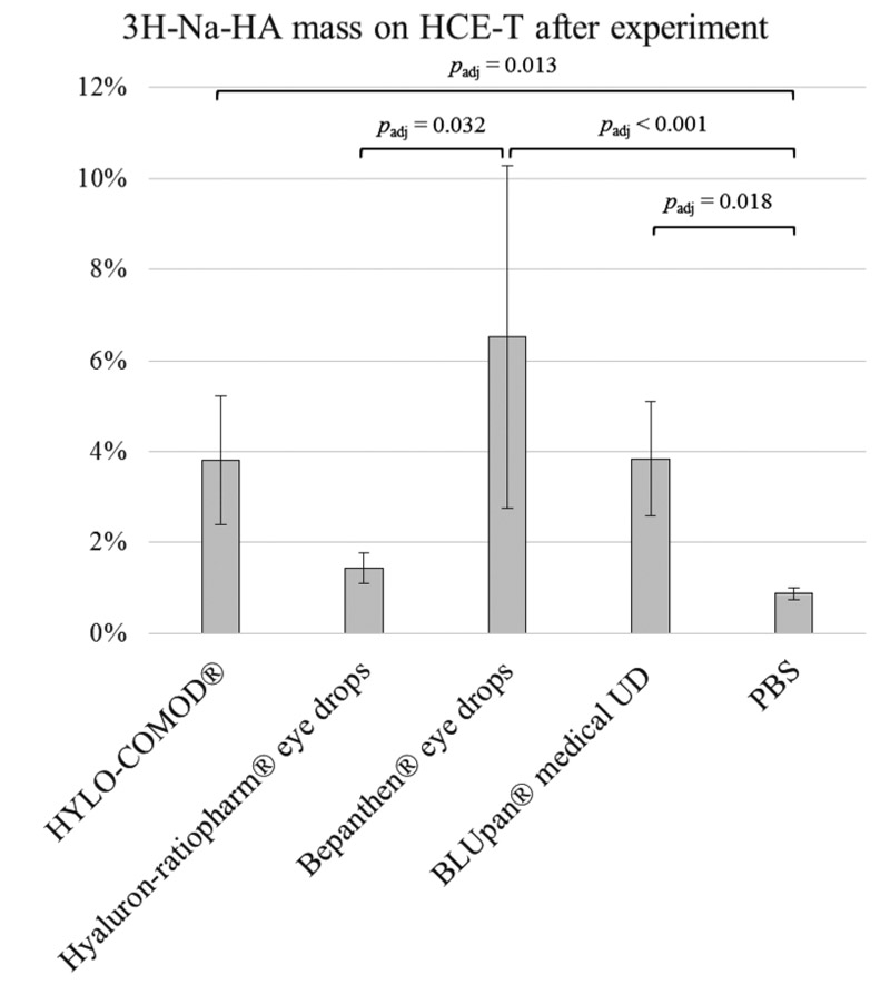 Consistent with the FC and porcine cornea experiments, the results of the declining channel set-up of HCE-T monolayers grown on CS showed that the retention rates were 3.8% ± 1.4% for HYLO-COMOD®, 1.4% ± 0.3% for Hyaluron-ratiopharm® eye drops, 6.5% ± 3.8% for Bepanthen® eye drops and 3.8% ± 1.3% for BLUpan® medical UD. This order was similar to that observed for 3H-Na-HA binding by the respective eye drops. As in the FC setting, the amount of 3H-Na-HA that was obtained from PBS (0.9% ± 0.1%) was considerably lower (Fig. 3). The total mass balance after the experiment was in the range of 87-110%, indicating a complete recovery. A statistical comparison of the Bepanthen® eye drops, the BLUpan® medical UD (padj = 1) and HYLO-COMOD® (padj = 1) showed that there were no differences among these treatments. However, there was a significant difference between the Hyaluron-ratiopharm® eye drops (padj ≈ 0.032) and the PBS control (padj < 0.001).