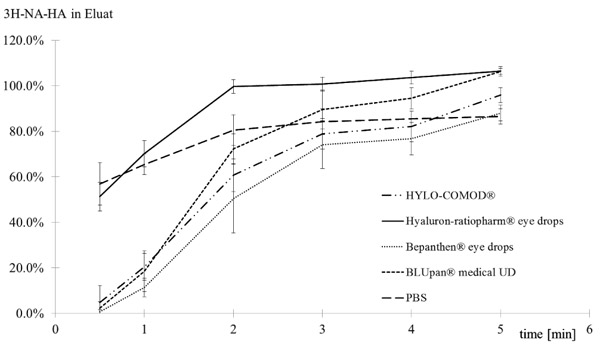 An analysis of the elution kinetics (Fig. 4) of 3H-Na-HA revealed that there were differences between the tested products. While HYLO-COMOD®, Bepanthen® eye drops and BLUpan® medical UD exhibited a sigmoidal increase in 3H-Na-HA over time, Hyaluron-ratiopharm® eye drops eluted distinctly faster in a pattern similar to that of PBS.