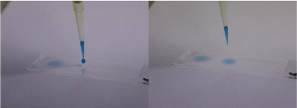In the dynamic study design, we used the dC model and in vitro HCE-T monolayers grown on CS. The dC concept was first introduced for mucosal tissues [17] and was later developed to evaluate mucoadhesion on corneas [18, 19]. The elution of ATF was performed using a KDS270 Continuous Cycling Syringe Pump (KD Scientific, Holliston, Massachusetts, USA). The final flow rate was set to 18 µL/min, in accordance with the in vivo human tear fluid turnout rate [20, 21]. In preliminary experiments performed to evaluate binding by 3H-Na-HA in ED, methylene blue (0.1%) was used as a surrogate to determine the experimental parameters, including the angle, number of needles, flow rates and elution zones (Fig. 1). This blue dye allowed the direct visualization of flow characteristics. The flow rate was initially started at 0.6 to 0.8 mL/min and was decreased to a 33- to 44-fold lower rate of 18 µL/min. Finally, it was necessary to use two needles to avoid the formation of “undiluted” zones at the edges of the CS. CS with HCE-T monolayers were placed on dC at an angle of approximately 11°. The angle was determined based on the height of a petri dish (15 mm) and the total length of the chamber slide (76 mm). A defined volume of 35 µL of 3H-Na-HA-spiked eye drops or PBS was applied to the upper end of the CS (between the two needles) containing HCE-T monolayers. The 35 µL volume (corresponding to approximately one ED drop) was applied while the CS was already at 11° and 250 µL buffer was applied at the bottom. In accordance with the study design used in the FC/ex vivo porcine cornea experiments, the duration of exposure was fixed at 5 min. All studies were conducted six times (n = 6).