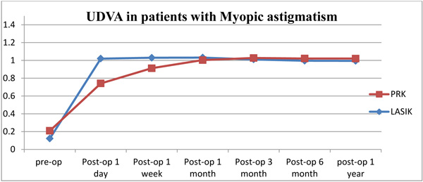 Fig. (2). UDVA in patients with myopic astigmatism underwent LASIK, PRK (pre-operatively to one-year interval).
