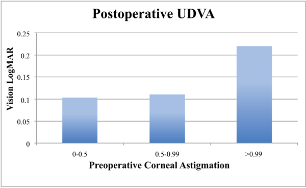 Cases with postoperative corneal astigmatism <1D in magnitude had better postoperative UDVA than those with >1D but these results did not reach statistical significance (0.11 [6/7.5+1] LogMAR vs. 0.16 [6/7.5+3] LogMAR respectively, p = 0.238). There was no difference in visual outcomes or surgically induced astigmatism between patients who had clear corneal temporal incisions vs. those who had clear corneal located on the steep axis (0.12 [6/7.5+1] vs. 0.12 [6/7.5+1] LogMAR respectively, p = 0.64) (0.43D vs. 0.55D respectively, p = 0.5).