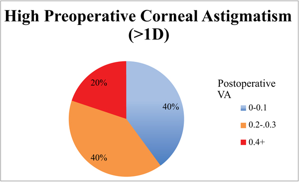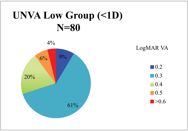 When the cohort was divided into 2 groups based on the magnitude of preoperative corneal astigmatism (low 0 - 0.99 D, n = 80; high >1 D, n = 14) the low astigmatism group achieved statistically significantly better results (Table 1, Figs. 1, 2, 3). The low astigmatism group achieved a UDVA of 0.11 (6/7.5) LogMAR (CI 0.085 - 0.124) and the high astigmatism group 0.21 (6/9.5) LogMAR (CI 0.129 - 0.285) (p=0.0151). We can see in Figs. (2 and 3) that, as well as having an average postoperative UDVA one Snellen line lower than the low astigmatism group, the high astigmatism group also had a higher likelihood of a poor (> 6/15) visual outcome (20% vs. 2%) (Figs. 2 and 3).