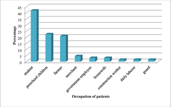 Ocular trauma was frequently observed in urban residents (76.1%, n=255) as compared to rural dwellers (23.9%, n=80). From all patients visited for ocular trauma, most of them (38.81%) were Islamic religion followers, followed by Protestants (35.82%). The occurrence of trauma was frequently observed in students (41.79%) (Fig. 2).