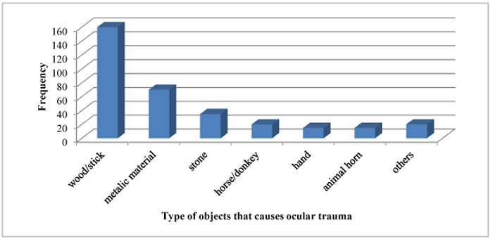 The common cause of ocular trauma in this study was wood/ stick (47.76%), but in other studies road traffic accident (western India-38%, Uttarakhand, India-32.7% and 26.66%) and stone (Kashmir valley-48.3%) were the main causes of ocular trauma [2, 3, 6, 13].