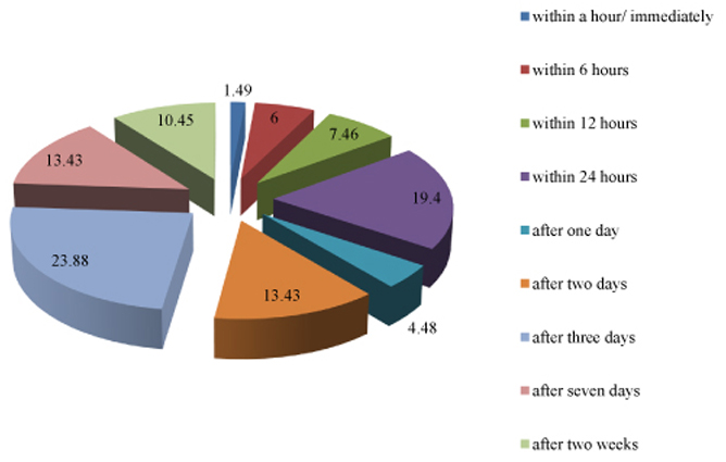 Majority of patients (92.54%, n=310) who encountered ocular trauma were presented to Hawassa University, tertiary eye care center after six hours from time of trauma and 47.76% (160) of them presented to the hospital after three days from time of trauma (Fig. 4).