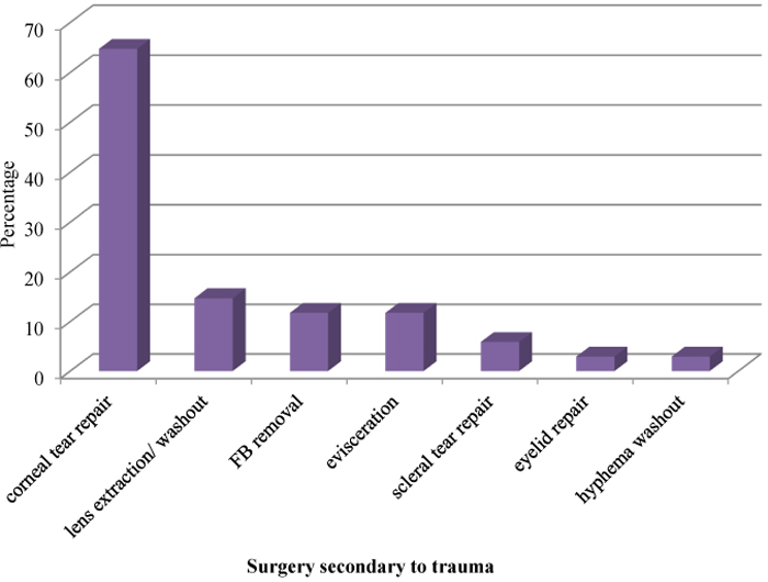 Most of the patients (95.52%) who presented for ocular trauma were intervened after 12 hours from the time of trauma. Only 1.49% of the total patients were treated immediately/ within 6 hours. Delayed presentation due to the distance from eye care center, lack of awareness and shortage of money were the common reasons for delayed intervention (76.12%). Ocular surgery secondary to trauma was performed in 50.8% (170) patients and among all; corneal tear repair was the most frequently performed surgery (64.7%), followed by crystalline lens extraction/ lens fragment washout (14.70%) (Fig. 5). Surgery, secondary to trauma, was associated with open globe injury (P = 0.006, AOR = 25.67)