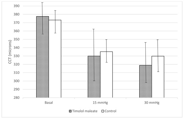 There were no significant differences in the basal central corneal thickness values (control group, 373.2±12.9 µm; study group, 377.5±19.2 µm, p=0.5) or the central corneal thickness values when the intraocular pressure was increased to 15 mmHg (control group, 335.2±14.3 µm; study group, 330.0±32.1 µm, p=0.6) and to 30 mmHg (study group, 318.8±25.3 µm; control group, 329.8±21.0 µm, p=0.3).