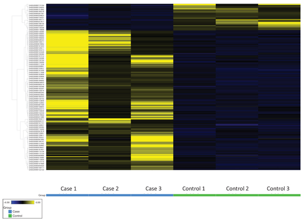 RNA-Seq yielded a total of 57,736 genes tested, and 352 genes were identified having adjusted p-values < 0.05 after excluding outliers. After filtering for a minimum read count of 5 for all cases and controls, 328 genes comprised the final differential expression signature of which 52 were downregulated and 276 were upregulated relative to controls Fig. (2). There were 44 genes with very low FDRs (< 0.0001), including 5 downregulated genes (-2.3 to -4.3 fold change) and 39 upregulated genes (+2.0 to +8.8 fold change) Table (2).