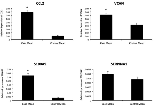 Total RNA was isolated from all patient samples using RNeasy Mini Kit (Qiagen, CA, USA). The primers were designed for qRT-PCR using Primer3. cDNA synthesis was performed using the standard protocol of BioRad (iScript cDNA Synthesis Kit, USA). qRT-PCR was performed in duplicate for each of the cases and controls for various top-ranked differentially expressed genes of interest: CCL2, S100A9, VCAN, and SERPINA1. Analysis of gene expression relative to the housekeeping gene ACTIN was performed as previously described.2 A Student’s T-test was performed to determine p-values and statistical significance between cases and an average of the three controls.