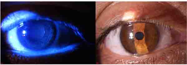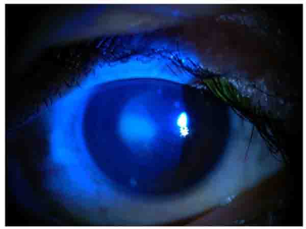 In slit lamp exam, corneal epithelial defect and mild sub epithelial infiltration were found Fig. (1). Corneal sensation was measured using Cochet–Bonnet esthesiometer (Luneau Ophthalmology, Paris, France) which indicated a decrease of corneal sensation. Although, corneal epithelial defect and abrasion were observed after fluorescein staining Fig. (2), he did not have any ocular pain, foreign body sensation, and photophobia, and his eyes were inappropriately quiet due to corneal sensation loss. In fundoscopy exam, optic disc was pale in the temporal zone but it had sharp margin and cup/disc ratio was approximately 0.3. Because of corneal epithelium defect, we did not perform Goldman applanation tonometry. After amelioration of corneal epithelium defect, we checked the intraocular pressure and it was normal. The tear meniscus was normal and he did not have an apparent dry eye; we performed Schirmer test for him and it was nearly normal (14mm). Other ocular examinations were normal.