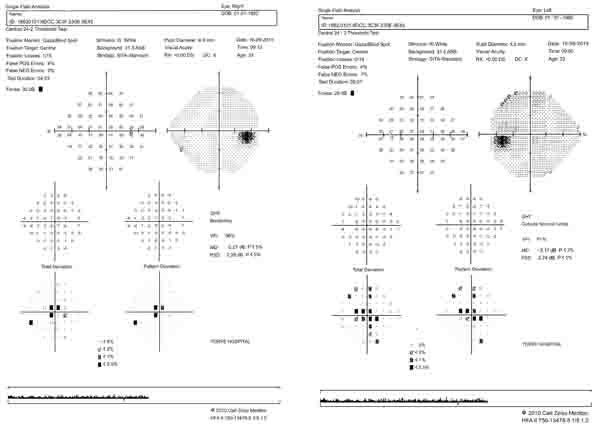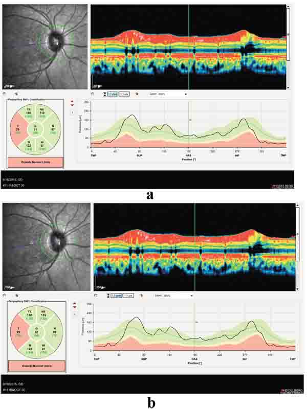 Positive points of our evaluation were: hyper intensity of posterior column in spinal MRI Fig. (3), hyper homocysteinemia (52 micromol/lit, Normal range < 15 micromol/lit), B12 deficiency (pretreatment level 195pgr/ml, Normal range 200-900 pgr/ml), Iron deficiency and normocytic anemia. Peripapillary OCT showed temporal atrophy of optic disc Fig. (4a,b). Perimetry also showed a small paracentral scotoma in the patient’s visual field Fig. (5a,b).