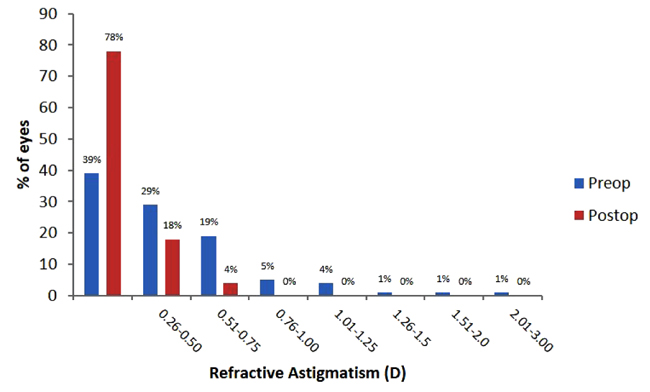 Prior to surgery, 68% of patients had astigmatism of ≤0.5 D (Fig. 2). Average postoperative refractive astigmatism was 0.17 ± 0.23 D at 1 month and 0.16 ± 0.23 D at 3 months postoperatively, with 96% of patients being ≤0.5 D (Fig. 2).