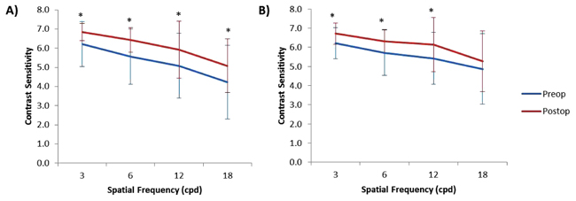 Postoperative CS against both horizontal and vertical gratings increased compared to preoperative values at all spatial frequencies with the exception of 18 cycles per degree (cpd) for vertical gratings (Figs. 3a and 3b). Postoperative CS against horizontal gratings increased from 6.21 ± 1.17 to 6.84 ± 0.44 at 3 cpd (P = 0.003), from 5.55 ± 1.45 to 6.42 ± 0.64 at 6 cpd (P = 0.001), from 5.08 ± 1.70 to 5.92 ± 1.50 at 12 cpd (P = 0.02) and from 4.24 ± 1.92 to 5.08 ± 1.40 at 18 cpd (P = 0.03) (Fig. 3a). Postoperative CS against vertical gratings increased from 6.21 ± 0.81 to 6.71 ± 0.57 at 3 cpd (P = 0.002), from 5.71 ± 1.18 to 6.32 ± 0.62 at 6 cpd (P = 0.007), and from 5.42 ± 1.35 to 6.13 ± 1.42 at 12 cpd (P = 0.03) (Fig. 3b). There was no significant change in contrast sensitivity against vertical gratings at 18 cpd (Fig. 3b).