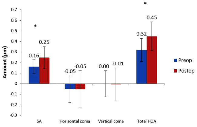 Average SA increased by 52% from 0.162 ± 0.065 µm preoperatively to 0.247 ± 0.105 µm at 3 months postoperatively (P = 0.000) and total HOA RMS increased by 41% from 0.320 ± 0.109 µm preoperatively to 0.450 ± 0.136 µm at 3 months postoperatively (P = 0.000) (Fig. 4). There was no significant change in horizontal or vertical coma (Fig. 4).