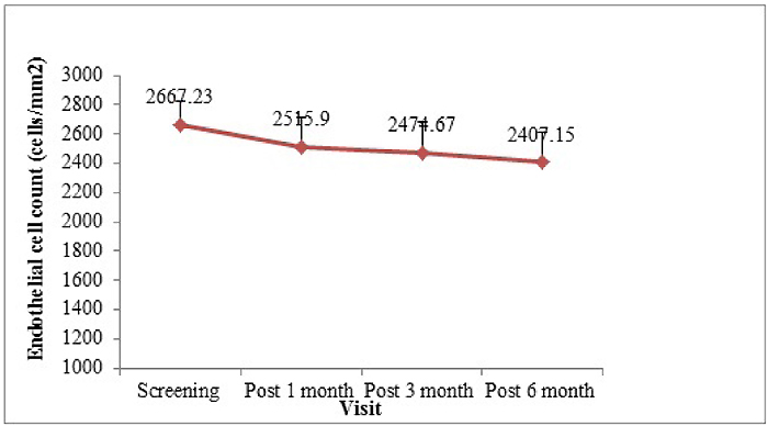 The endothelial cell count (mean±SD) was 2667.23±160.48 cells/mm2 during screening visit which decreased to 2515.90±199.65, 2474.67±205.19, and 2407.15±205.33 cells/mm2 after 1 month, 3 months, and 6 months of surgery, respectively (Fig. 2). The difference from the screening visit was -156.89±144.36, -208.85±172.15, and -268.49±186.56 cells/mm2 after 1 month, 3 months, and 6 months of surgery, respectively (p<0.0001). The endothelial cell loss was -5.67%, -7.22%, and -9.75% 1 month, 3 months, and 6 months after surgery compared to the endothelial cell presented during the screening phase.