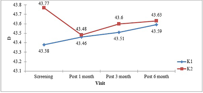 Additionally, keratometry was also performed at screening, after 1 month, 3 months and 6 months of surgery. The K1 value (mean±SD) was 43.38±1.68 D during screening period which was 43.46±1.36, 43.51±1.37, and 43.59±1.36 D after 1 month, 3 months, and 6 months of surgery respectively (Fig. 3). The K2 value (mean±SD) was 43.77±1.82 D during screening period which at 1 month, 3 months, and 6 months after surgery was 43.48±1.61 D, 43.60±1.52 D, and 43.63±1.51 D, respectively. In all the subjects, K1 and K2 values were between 35-50 D.