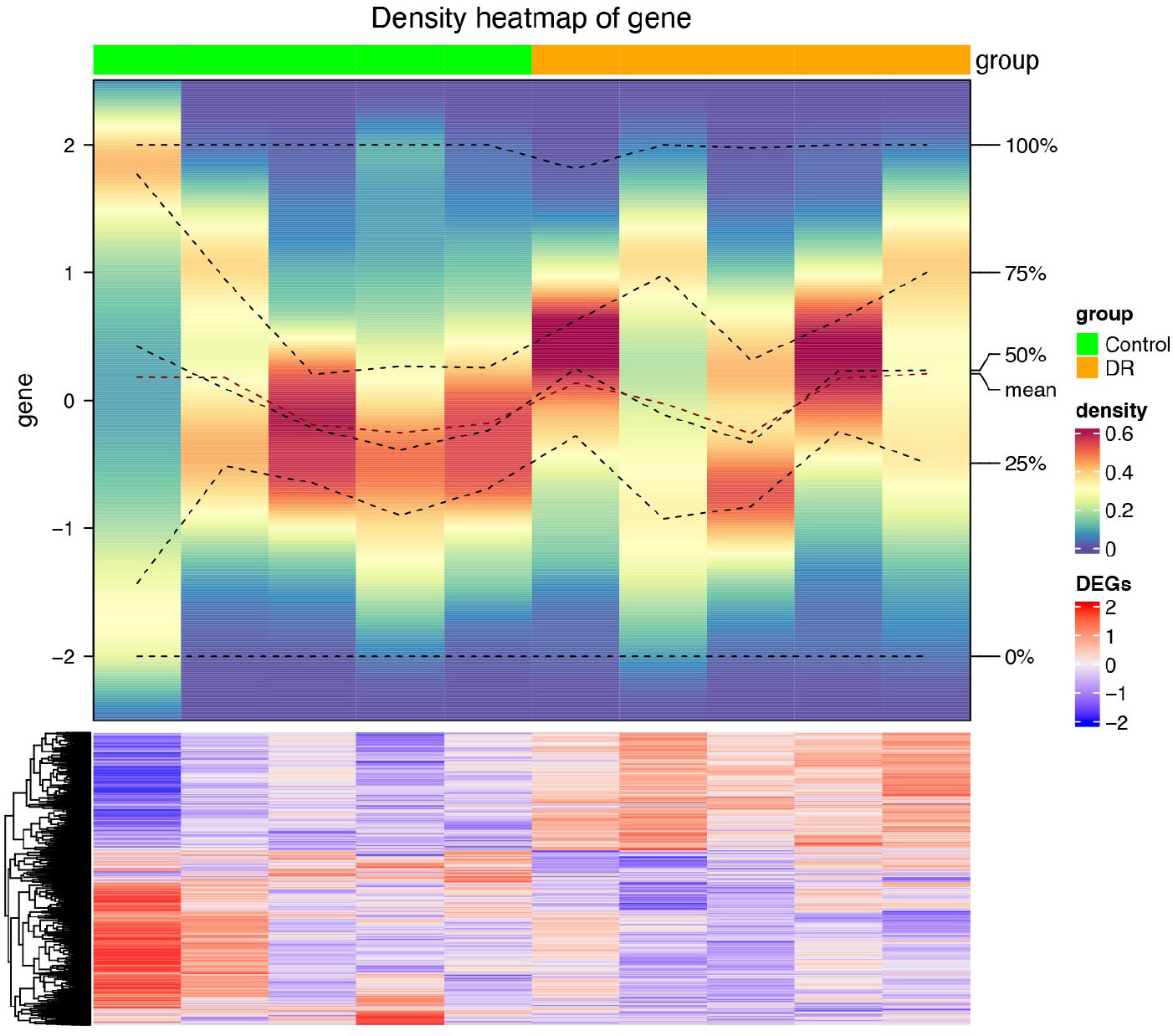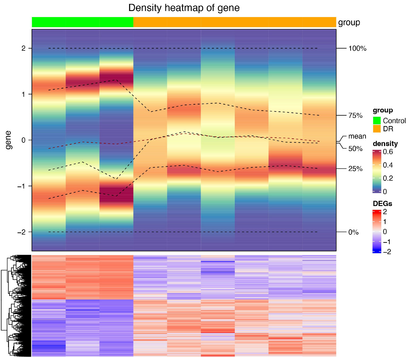 Heatmap of differentially expressed genes between DR vs. control. Green represents control group samples, while yellow represents DR group samples. The color density in the middle heatmap represents the expression density of samples, with a deeper red color indicating higher density. The gray bar annotation indicates the number of samples. The horizontal axis represents samples, and the vertical axis represents genes. Red indicates high-expression genes, while blue indicates low-expression genes.