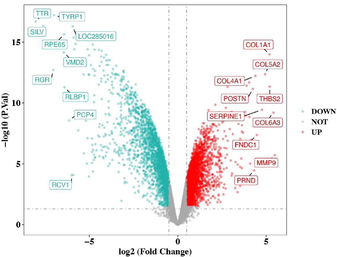 Volcano plot of differentially expressed genes between DR vs. control. Each point on the plot represents a gene, with differential thresholds set at |log2FC| > 0.5 and p-value < 0.05.