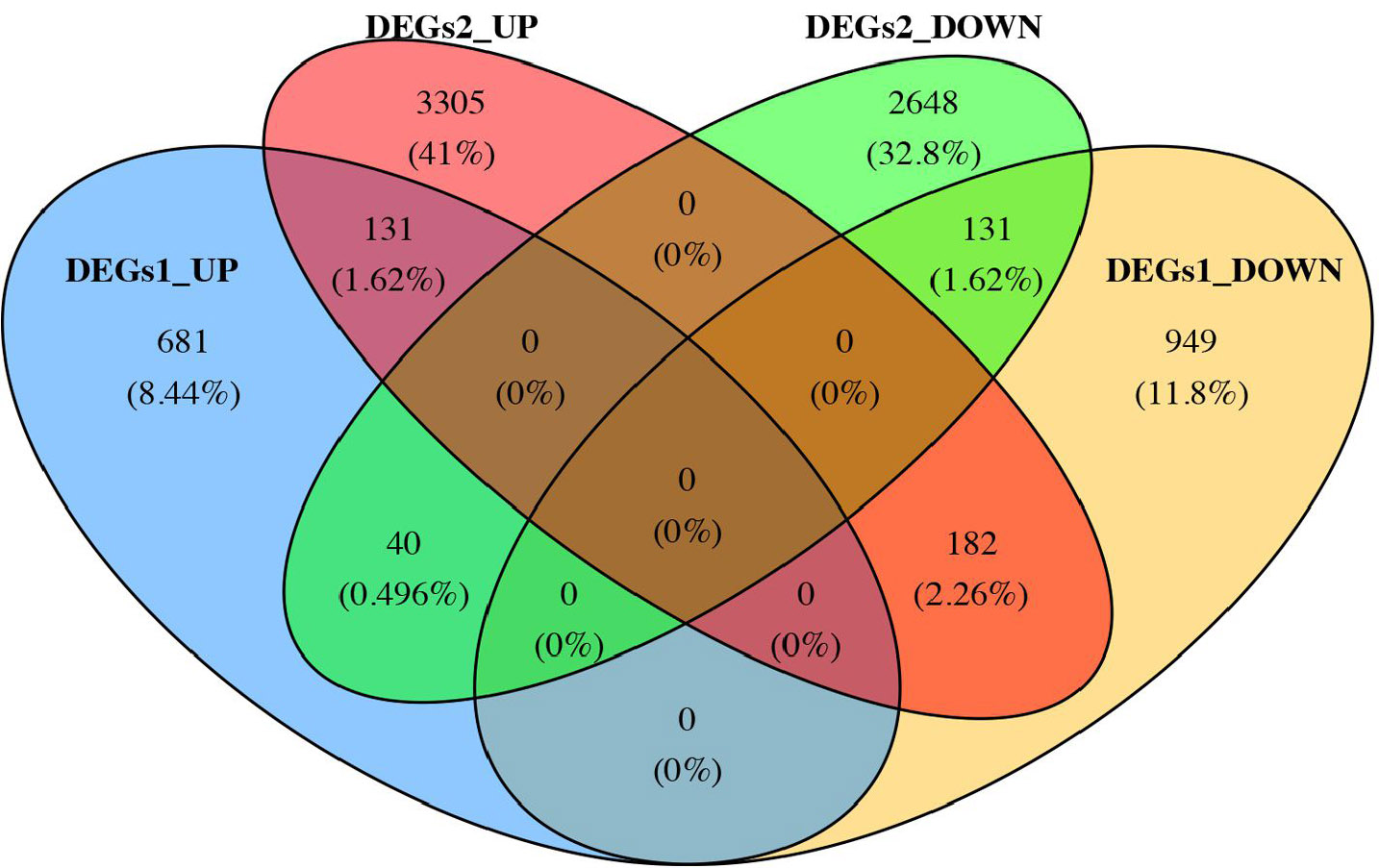 Firstly, the Differentially Expressed Genes 1 (DEGs 1) (DR vs. control) in GSE185011 and the DEGs 2 (DR vs. control) in GSE60436 were separately identified using the “DESeq2” (version 1.38.0) [13] and “limma” (version 3.54.0) [14] (p < 0.05,∣log2 Fold Change (FC)| > 0.5). Then, DEGs 1 and DEGs 2 were separately visualized using the volcano plot and heat map through “ggplot2” (version 3.4.1) [15] and “ComplexHeatmap” (version 2.14.0) [16], respectively. Afterward, the common DEGs (CO-DEGs) were selected by integrating the intersection of up-regulated genes from DEGs 1 and DEGs 2, and the down-regulated genes from DEGs 1 and DEGs 2. Next, the candidate biomarkers were identified by overlapping the CO-DEGs and LRGs.
