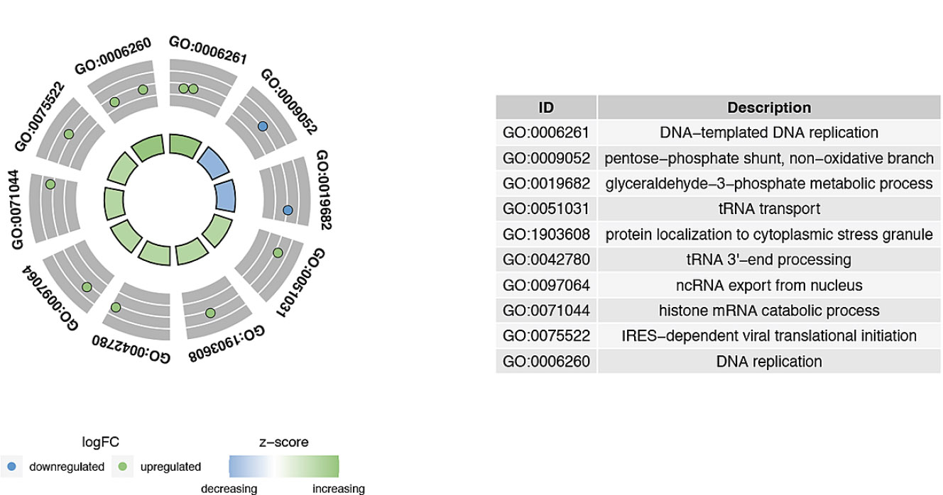 Chord diagram of candidate gene GO enrichment. The outermost circle represents the ID numbers of enriched pathways. The table on the right corresponds the ID numbers to pathway names. The gray layer one level inward shows the distribution of gene logFC, with different colors indicating up-regulation and down-regulation. The innermost circle represents the Z-score values of pathway enrichment.