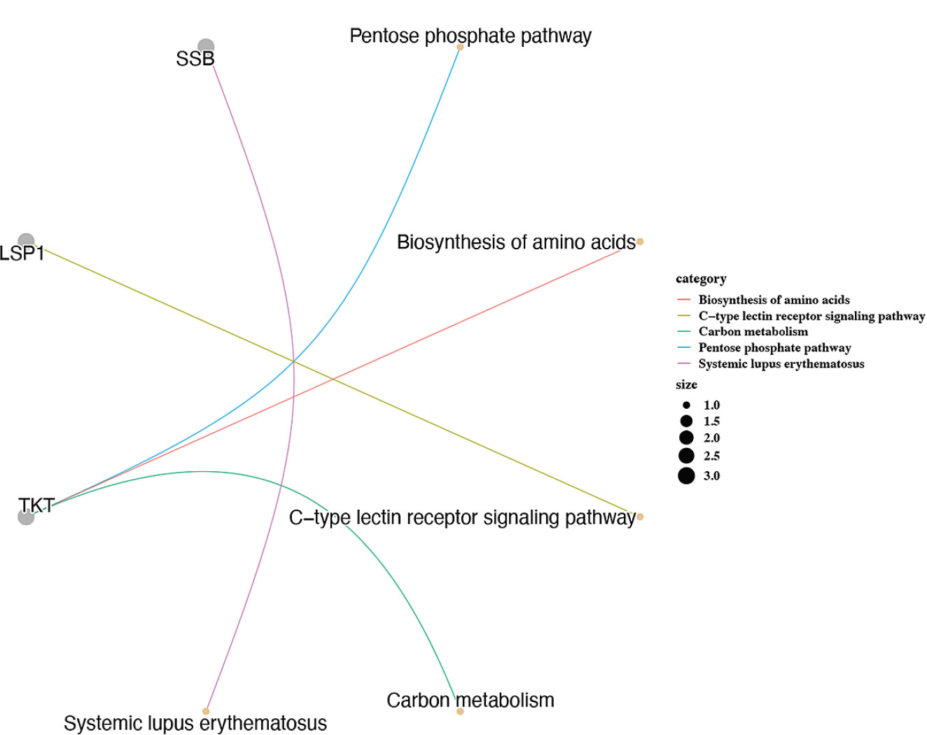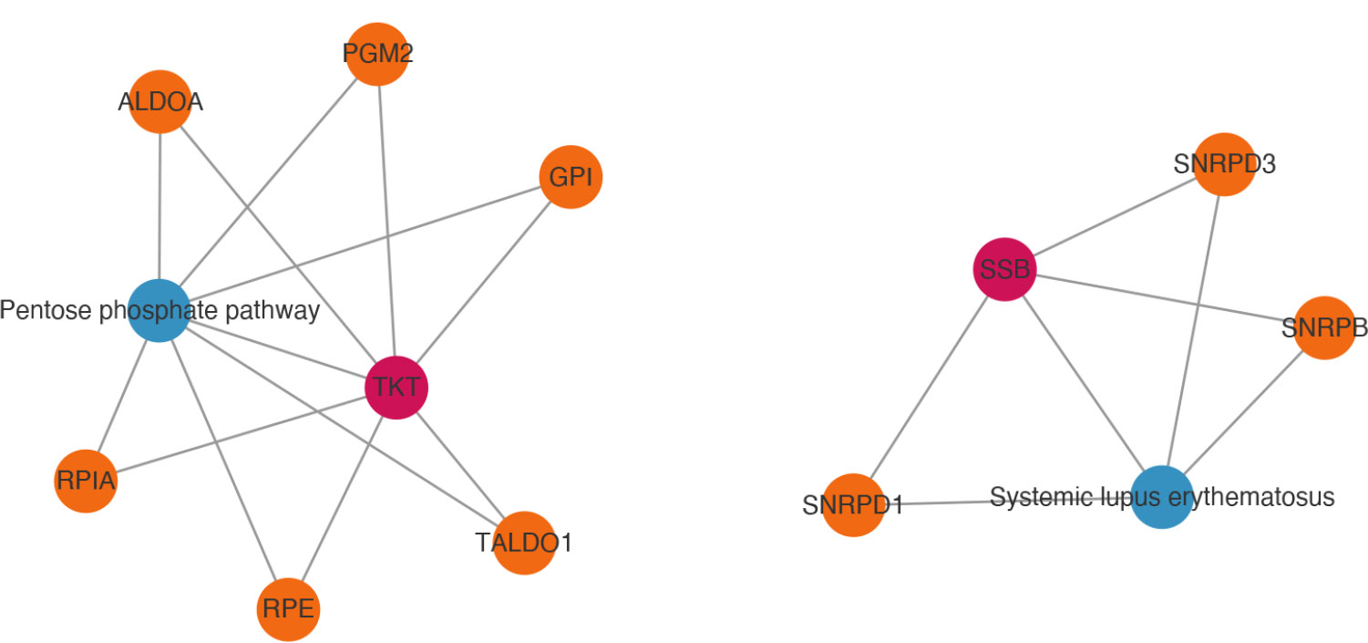 Firstly, there were 2 biomarker-pathway-gene networks searched. One of these was TKT-pentose phosphate pathway-genes (PGM2, TALDO1, ALDOA, RPE, GPI, RPIA), and the other was SSB-systemic lupus erythematosus-genes (SNRPD1, SNRPD3, SNRPB) (Fig. 6A). These results might imply that biomarkers play an important role in the occurrence and development of related diseases, such as diabetes mellitus and systemic lupus erythematosus.