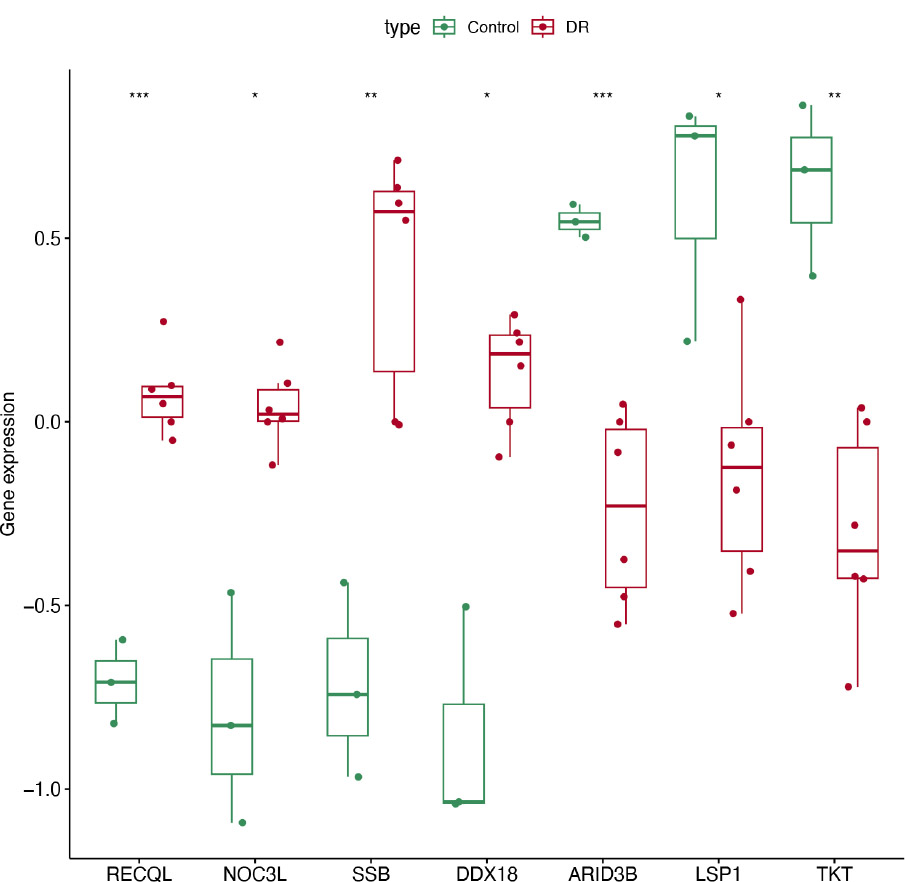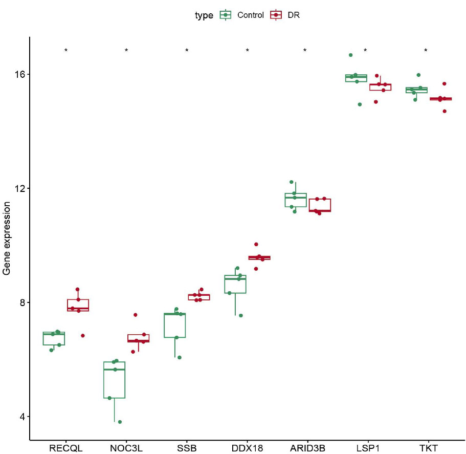 Importantly, we compared the differences in the expression of candidate genes in the DR and control samples in GSE185011 and GSE60436. RECQL, NOC3L, SSB, and DDX18 showed significantly high expression in DR samples, while ARID3B, LSP1, and TKT showed significantly high expression in control samples, and this expression trend was consistent in both GSE185011 and GSE60436 (Fig. 2C-D). Thus, the 7 genes (RECQL, NOC3L, SSB, DDX18, ARID3B, LSP1, TKT) were further identified as biomarkers.