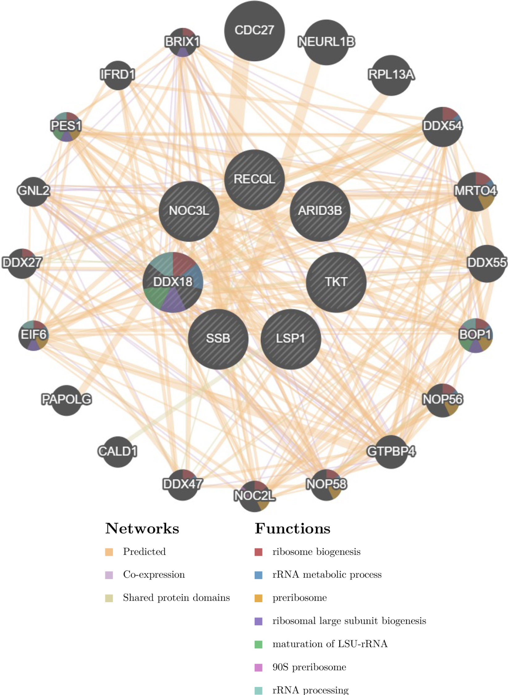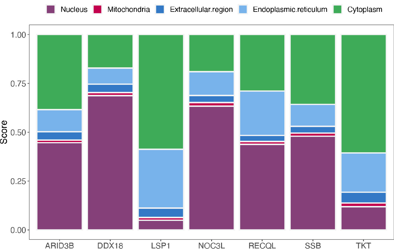 For subcellular location analysis, ARID3B, DDX18, NOC3L, RECQL, and SSB had higher scores in the cytoplasm, suggesting that they may be involved in biological processes related to the cytoplasm. In additional, the scores of LSP1 and TKT were higher in the nucleus, indicating that they may be located in the nucleus (Fig. 5A).