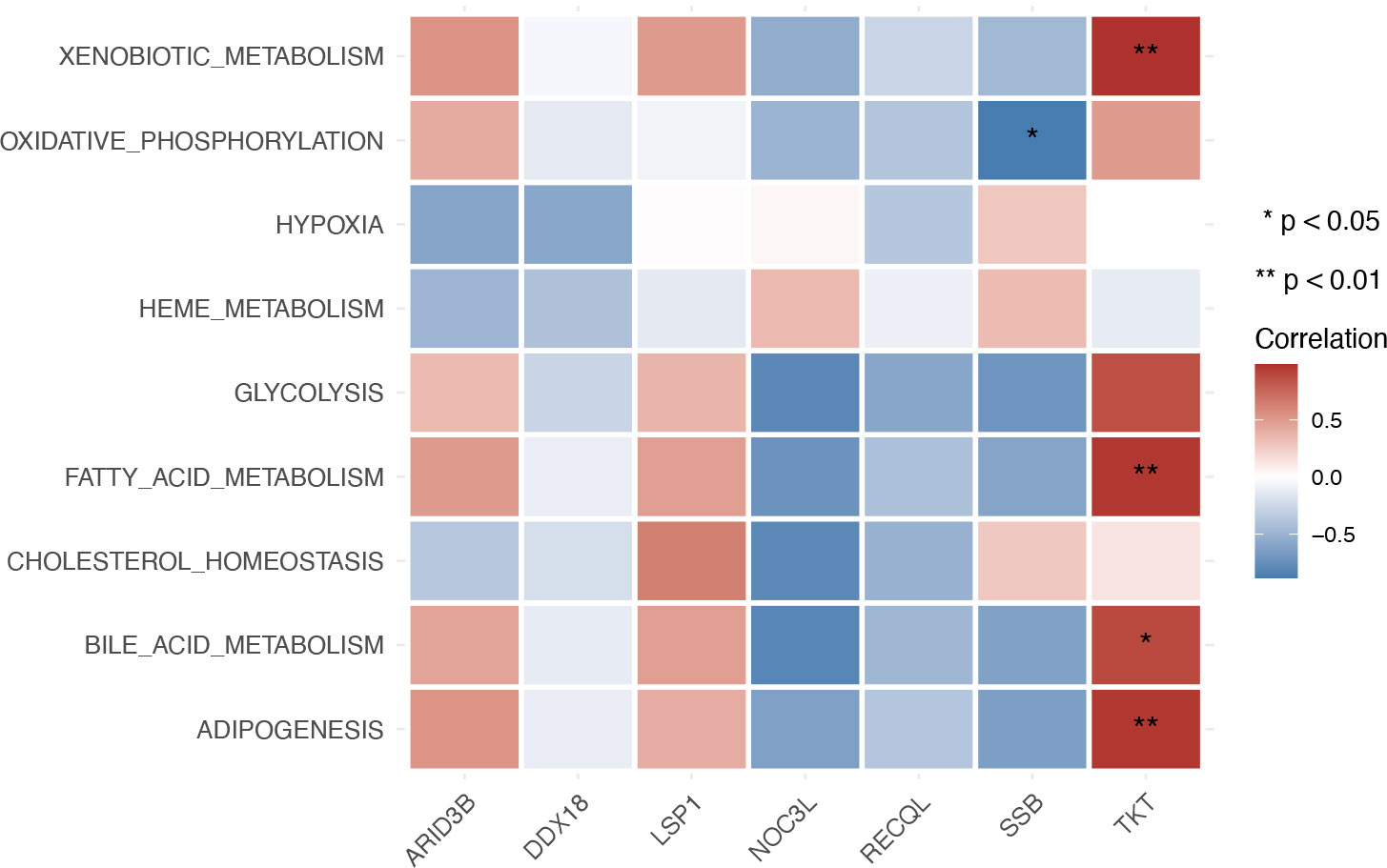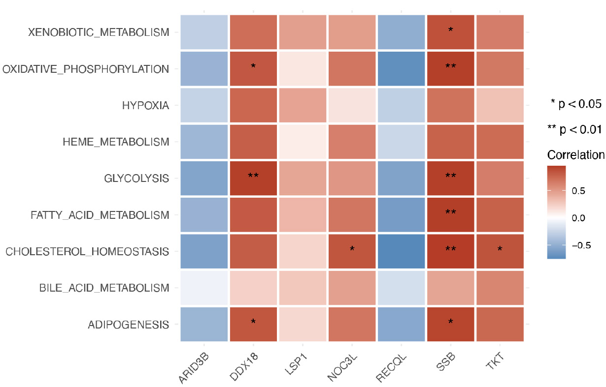 We also analyzed the correlation between biomarkers and metabolic pathways. In the blood training dataset (GSE185011), TKT exhibited a significant positive correlation with xenobiotic metabolism [23], fatty acid metabolism [24], bile acid metabolism, and lipid biosynthesis pathways. In the tissue training dataset (GSE60436), SSB showed a significant positive correlation with xenobiotic metabolism, oxidative phosphorylation, glycolysis [25], fatty acid metabolism, cholesterol homeostasis, and lipid biosynthesis pathways.