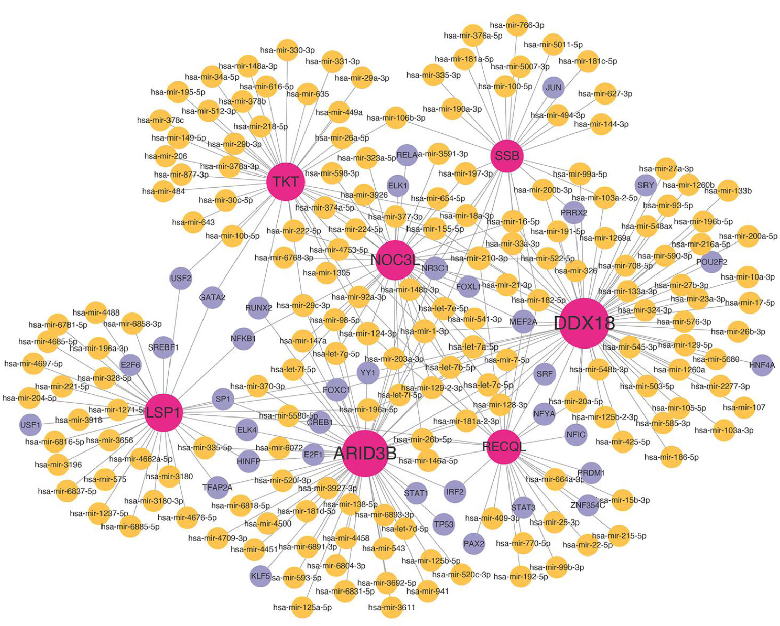 TF-miRNA-biomarker regulatory network analysis. Red nodes represent biomarkers, yellow nodes represent miRNA, and purple nodes represent TF (Transcription Factors).