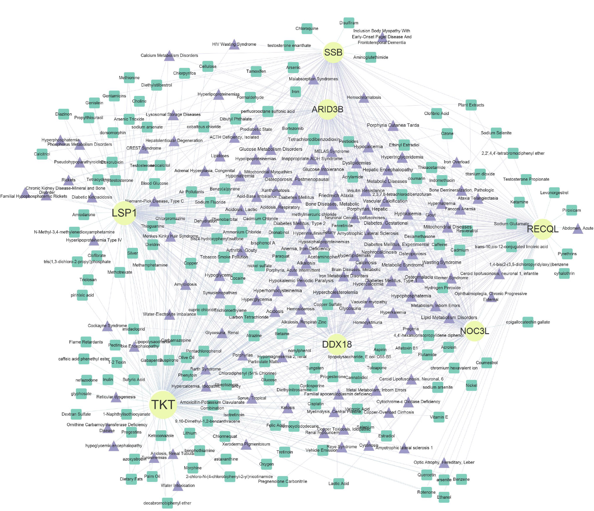 Besides, by CTD, 130 diseases and 167 drugs (Resveratrol, Cyclosporine, and Ethinyl Estradiol) were predicted, and a disease-biomarkers-drugs was constructed, such as Lipid Metabolism Disorders-NOC3L-Acetaminophen, Niemann-Pick Disease, Type C-LSP1-bisphenol A, and others (Fig. 6C).