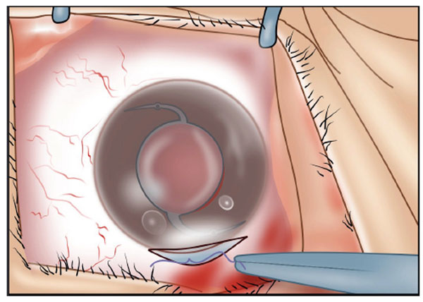 The tip of the curved needle of 9-0 polypropylene to which the IOL eyelet is fastened is then passed behind the iris knuckle to emerge at the inner lip of the scleral tunnel.