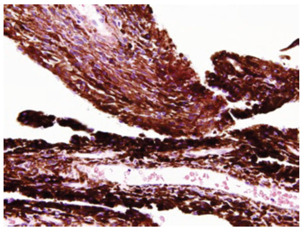 The PPM was surgically resected from both eyes under general anesthesia. A superior clear corneal incision was made using a 2.4 mm keratome. Then a high-viscosity viscoelastic material (Opegan-Hi™, Santen, Osaka, Japan) was injected into the anterior chamber and behind the iris to separate the PPM from the anterior lens capsule (Fig. 2), after which the strands were excised with a curved iris scissors. Next, residual strands were removed completely by irrigation and aspiration, after which hydration of the superior corneal wound was done with sterile balanced salt solution (OpeGuard Neo Kit®; Senju, Osaka, Japan). Histopathological examination revealed typical features of normal iris tissue in the excised membranes (Fig. 3). Each specimen consisted of a thin fibrovascular membrane containing small vessels, fibrocytes, and stromal melanocytes. Melanin-rich pigment epithelial cells covered the surface of the membrane that was closest to the pupillary margin.