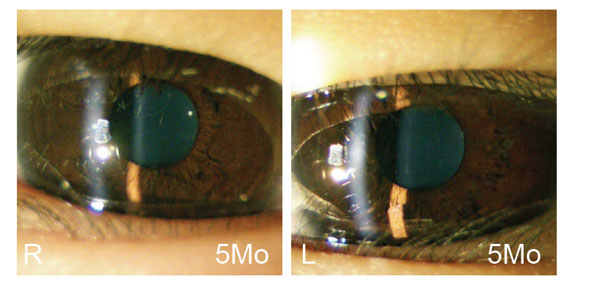 Anterior segment photographs obtained 5 months after surgical treatment of bilateral persistent pupillary membrane (PPM).