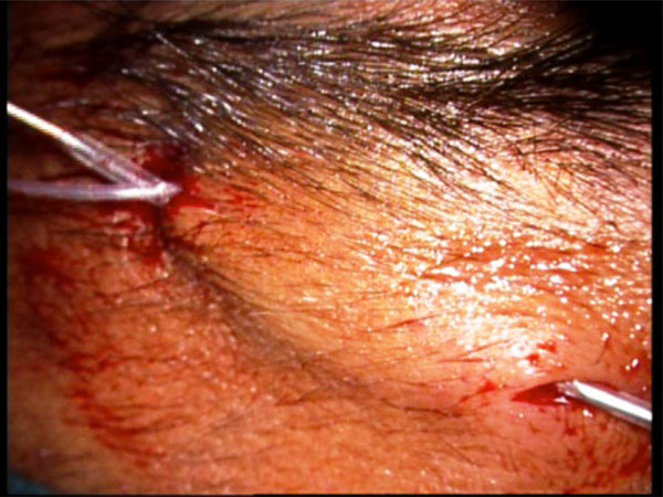 The 18 G intravenous catheter is passed from the central incision to the brow incision marking.